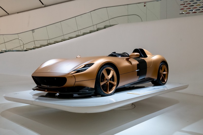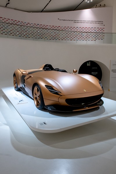 - Ferrari Monza SP1 – Anno 2018, la prima della serie Icona: le serie speciali limitate ispirate alla grandi vetture Ferrari del passato, reinterpretano quello stile senza tempo secondo canoni moderni accompagnandolo con contenuti altamente tecnologici ed elevate prestazioni. Qui in esposizione in un originale color oro, ripreso anche nei cerchi ruota e in altre componenti interne, e da una caratterizzante fascia trasversale a contrasto tipica delle livree personalizzate di alcune vetture da competizione degli anni ’50 e ‘60.
