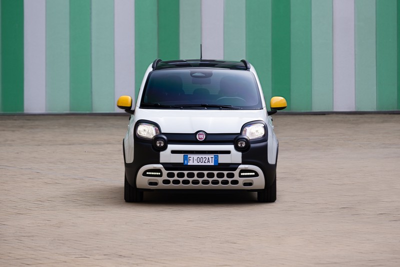 Gli esterni sono arricchiti da dettagli giocosi come il musetto di un panda sul coprimozzo, le calotte degli specchietti retrovisori gialli, la scritta Pandina sulle modanature laterali e la serigrafia “Pandina” sul finestrino posteriore.
