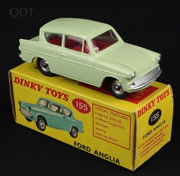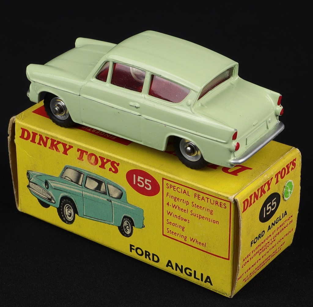 La Ford Anglia 105E, catalogo 155, è uno dei modelli più popolari della Dinky inglese. Prodotto dal 1961 al 1966, ha conosciuto pochissime varianti di colore, con le carrozzerie che vanno da un celeste carico a tonalità più sul grigio e rossi o celesti1.