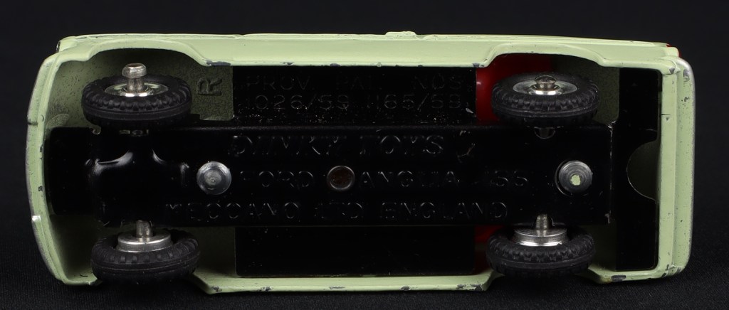 In Inghilterra venne realizzato un promozionale in colore verde pallido, donato al personale e ai giornalisti in occasione dell’apertura della fabbrica Ford a Halewood, Liverpool, l’8 marzo 19632. Alcuni esemplari raggiunsero dei negozi selezionati, altri furono inviati per posta a collezionisti. Gli interni del modello sono rossi e la scatola è quella standard (per la Ford Anglia è stato stampato un solo tipo) ma con un pallino verde attaccato su uno dei lati di apertura, come era costume anche su altri modelli di serie. Il promozionale di Liverpool, come si immaginerà facilmente, non è un incontro facile: nel 2008, Quality Diecast Models (QDT) vendette un esemplare in condizioni piuttosto buone con scatola per 1495 sterline. Nei giorni scorsi ne è apparso un altro, stavolta messo molto meglio, che messo in asta ha raggiunto le 3703 sterline.