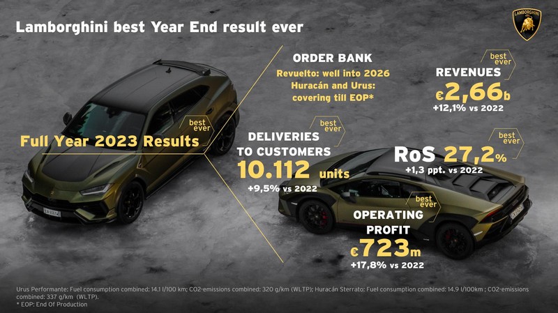 Il 2023 è stato l’anno migliore di sempre per Automobili Lamborghini, con risultati finanziari che confermano la continua crescita della casa di Sant’Agata Bolognese. Dopo aver superato per la prima volta nella storia il tetto delle 10.000 vetture consegnate nell’anno appena trascorso (esattamente 10.112), Lamborghini ha fatto registrare altre cifre record, tra le quali il fatturato, chiuso a 2,66 miliardi di euro, con un +12,1% rispetto al 2022.