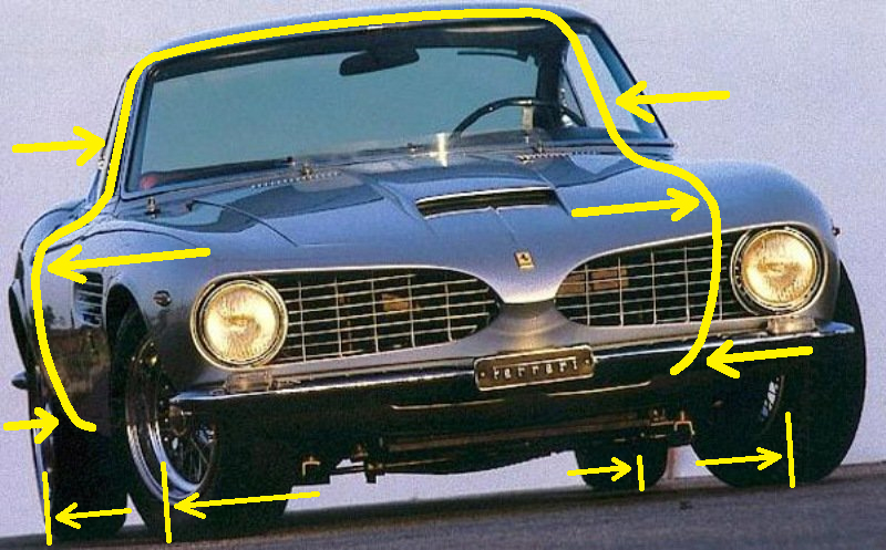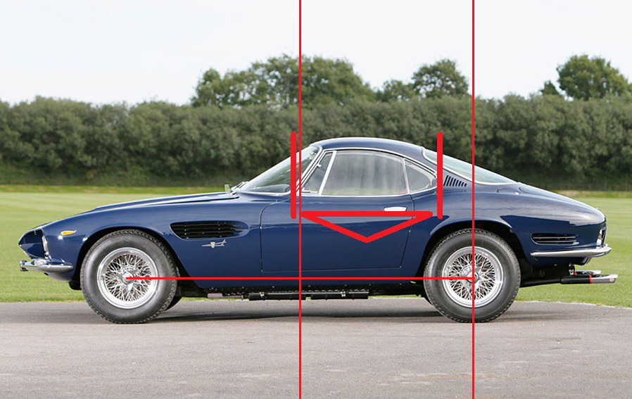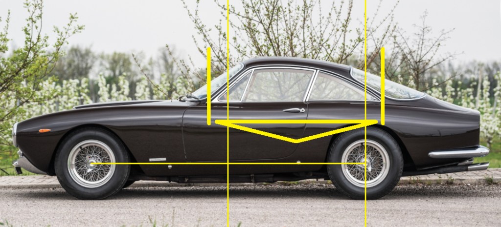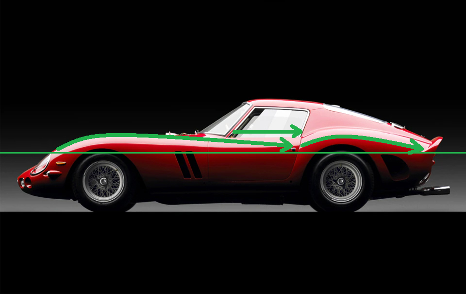 Verso il cuneo. In forte anticipo sugli anni ‘70, la #3269GT sperimenta un distacco educato dai suoi tempi riguardo alla direzione delle linee di forza in cintura: la GTO conserva il classico andamento discendente dal muso alla coda, mentre la Bertone precorre la forma a cuneo, aiutata anche dal taglio ascendente della base del finestrino. Ne risultano un maggior bilanciamento tra i vettori che puntano al muso e alla coda e un minor peso grafico su ruota e sbalzo posteriori; conquiste, queste, neanche oggi di comune dominio. E non è solo la linea di cintura a lavorare sull’armonia.