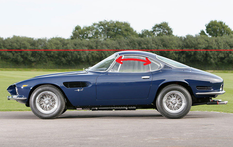 Non oltre l’asse posteriore. Per la Berlinetta Lusso Pininfarina, conosciuta come GTL, viene preparato un maggior spazio dietro i sedili, pur non adatto a passeggeri; quindi il montante C inizia e finisce ben oltre l’asse posteriore e la faccia laterale dell’abitacolo sta perfettamente tra la metà e il termine del passo di 2400mm. Il montante C della Bertone inizia prima e finisce in corrispondenza del centro ruota; quello A sembra arretrato in favore di un parabrezza più avvolgente; così, l’abitacolo è più corto e avanzato, alleggerisce il posteriore e conserva comunque fluidità grazie al tetto molto curvo. A prova della volontà di contenere il secondo volume in favore degli altri, c’è un’altra abile mossa.