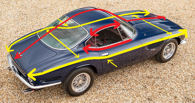 Tetto pettinato. La cornice superiore della portiera nella SWB scende soltanto all’indietro; nella Bertone è più curvata e punta anche in avanti. Così il tetto prende una forma più tesa e sembra trarre forza già dalla base del parabrezza, con cui fa linea continua, invece che dalla sommità. Insomma, come nelle auto moderne un unico arco a raggio variabile disegna tutto l’abitacolo. Ma il sistema di sinergie continua con le proporzioni.