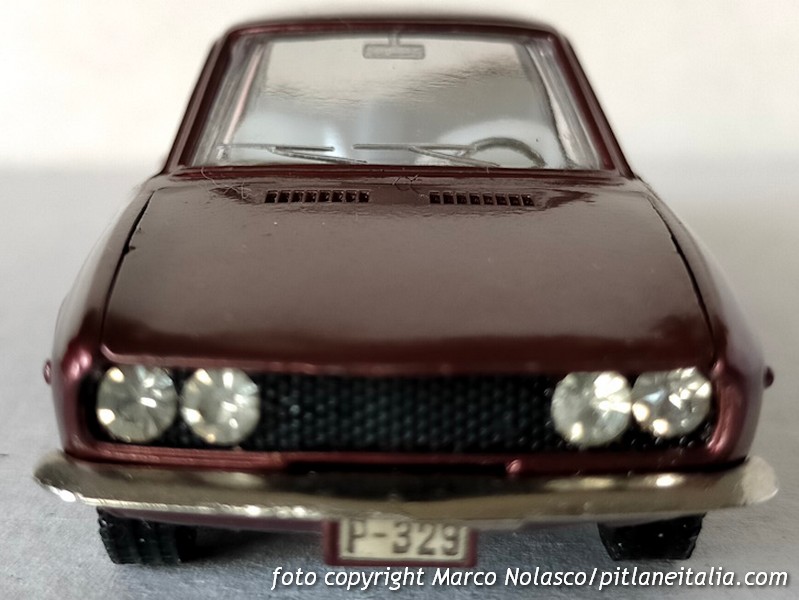 Il modellino, disponibile in vari colori, uscito nel 1969 non aveva decals se non la targa posteriore. Nel 1970 fu arricchito da una poco realistica, visto il modello, placca da rally sul cofano anteriore, che poteva essere del Rally di Montecarlo, della Coppa delle Alpi, come la mia, del Rally dell’Elba, della Liegi-Sofia-Liegi, del Rally dei Fiori, del Rally dei Tulipani o del Rally dell’Acropoli.