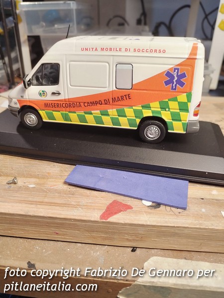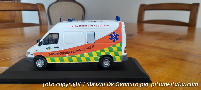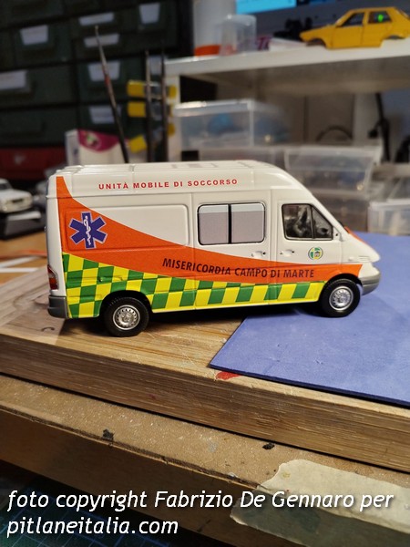 Con questa elaborazione, Fabrizio De Gennaro si allontana dalle consuete tematiche dei costruttori italiani per cimentarsi in un’elaborazione di un Mercedes Sprinter Eligor 1:43, trasformato da furgone in ambulanza della Misericordia di Campo di Marte (quartiere nell’area nordest Firenze). Le decals sono state disegnate interamente al computer, e non si è trattato certo di un’esecuzione facile. Evitando di aprire il modello per ricavare la finestratura, anche i vetri laterali e posteriori sono stati riprodotti in decals, con un risultato ampiamente accettabile. Ancora una bella elaborazione, quindi, che va ad arricchire una collezione privata di ambulanze.