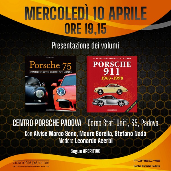 | Mercoledì 10 aprile alle ore 19.15, presso il Centro Porsche Padova, si svolgerà la presentazione dei volumi: PORSCHE 75 Settantacinque vetture che hanno fatto la storia di A.M. Seno PORSCHE 911. 1963-1998 Nuova edizione di M. Borella Interverranno gli autori Alvise Marco Seno, Mauro Borella e l’editore Stefano Nada. Modera l’incontro Leonardo Acerbi, direttore editoriale della Giorgio Nada Editore. Seguiranno firma copie e aperitivo. Centro Porsche Padova, C.so Stati Uniti, 35 – Padova PRENOTAZIONE OBBLIGATORIA, cliccare QUI per riservare il posto |
