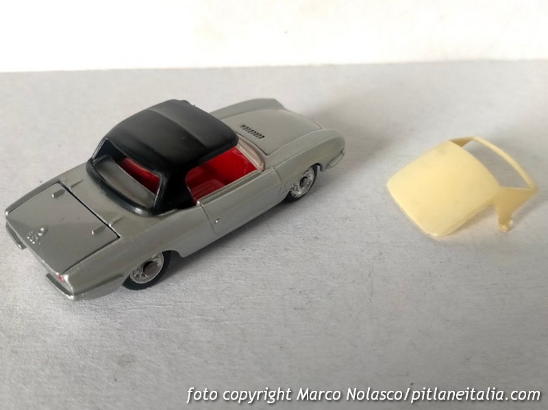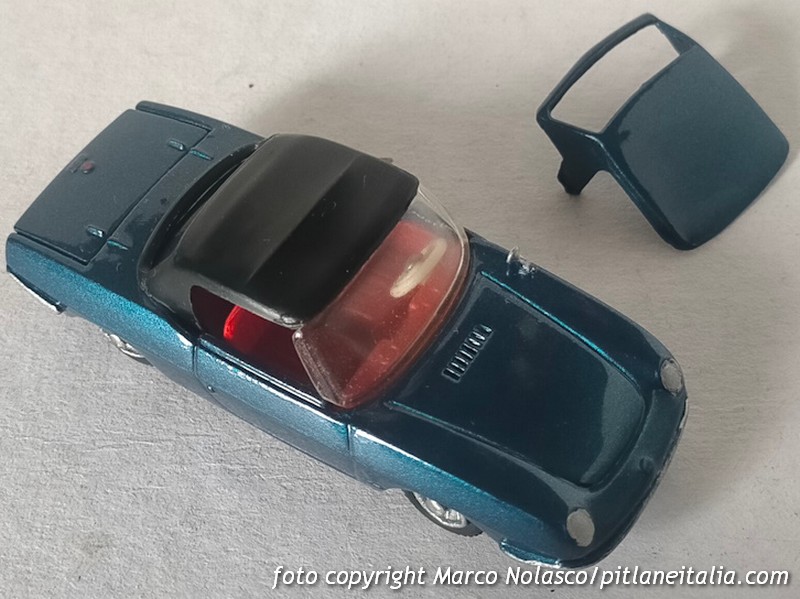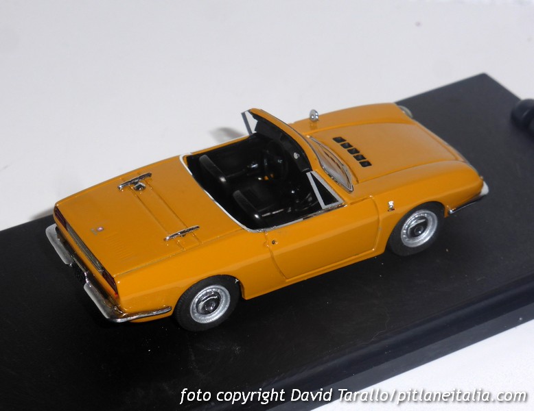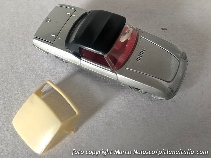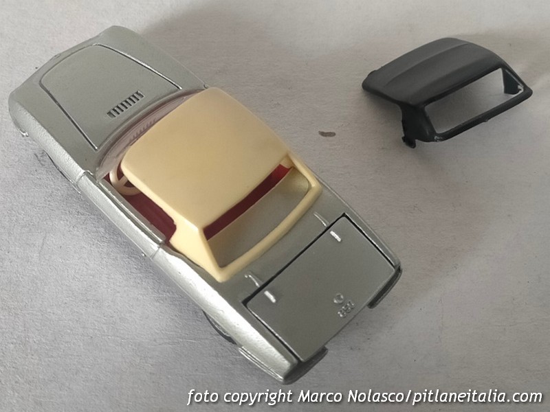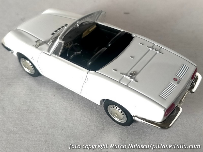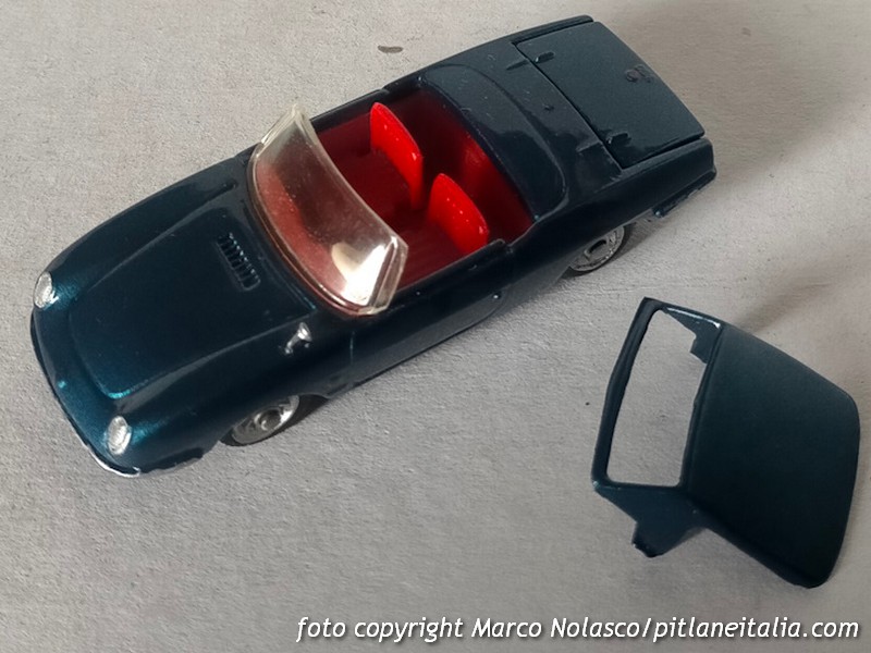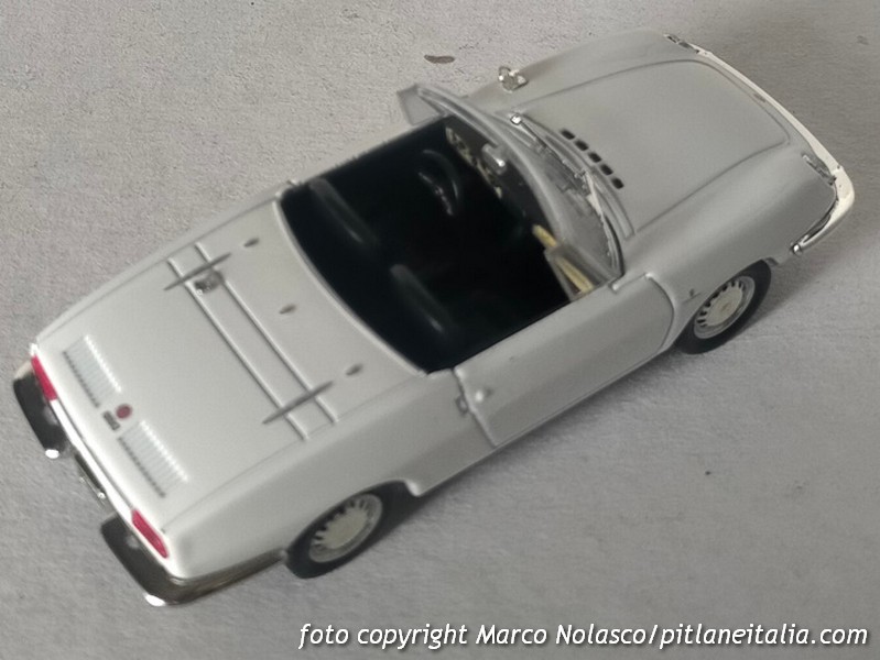La scala è rispettata, ma l’assetto è un pelo basso. E’ corredato di capote nera “in tela” e di tettuccio rigido bianco, colore a parer mio non indicato per questa tinta della carrozzeria.