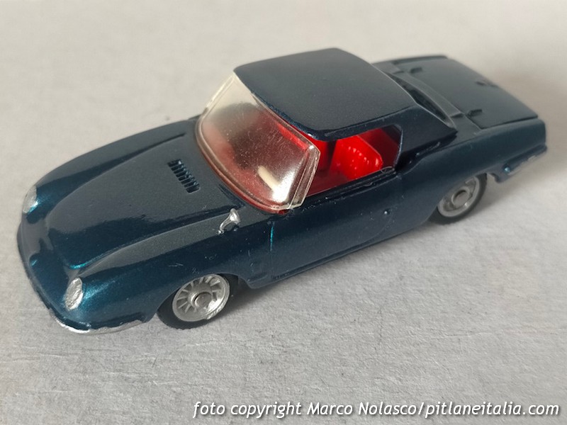 Il modellino è molto ben riuscito, come tutti gli Auto Pilen dell’epoca, ed è completamente apribile. Come nel Mercury l’assetto è troppo basso, ma non sono certo che siano parenti, se lo sono gli spagnoli hanno comunque modificato profondamente lo stampo torinese, per esempio sono state inserite le griglie di sfogo del cofano motore e la cornice del parabrezza. Purtroppo monta il solito cruscotto cromato. Anche la tinta non mi sembra realistica, ma non conosco la cartella colori della Seat.