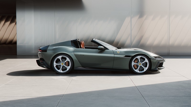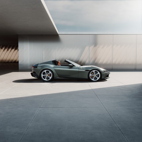 Linee maestre essenziali ne governano le geometrie, sottolineando volumi che formano un tutt’uno interconnesso. La fiancata, molto pulita, si sviluppa a partire da una sezione a diedro e percorre tutta la vettura. Pur mantenendo un certo aspetto sensuale, tipicamente Ferrari, sulla Ferrari 12Cilindri Spider i parafanghi sono trattati con grande precisione geometrica: le linee sono sempre frutto di intersezioni di volumi e c’è un approccio alla forma più funzionale che genera un effetto nient’affatto nostalgico. Il parafango posteriore è prominente, possente, ma anche perfettamente controllato dal punto di vista delle geometrie. Sul parafango anteriore il muscolo tende invece ad allungarsi leggermente, appoggiandosi sulla fiancata e accentuandone l’aspetto monolitico.