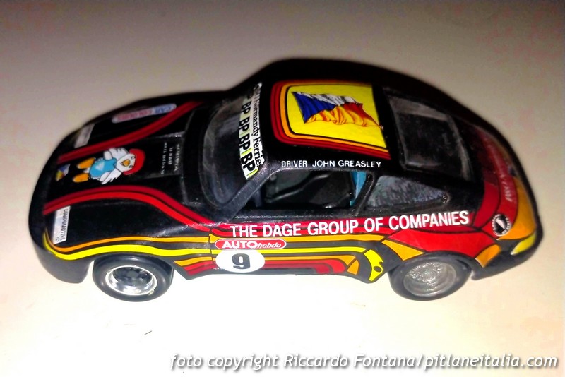 La vettura, particolare perché sprovvista di qualunque forma di alettone posteriore ma col muso “piatto” alla Porsche 935 (d’altronde il Rallycross permetteva di giocare con le carrozzerie, libero com’era da certi vincoli regolamentari propri dei Rally e delle gare in pista) è quella di John Greasley partecipante alla serie europea del 1978, quando il Rallycross era ai suoi massimi, con Franz Wurz ed Andy Bentza con le Stratos, Martin Schanche (mano sul cuore, gli appassionati capiranno…) con la Ford Escort, e Jan De Rooy col Maggiolino a darsi battaglia su e giù per il continente da Groppello Cairoli ad Auxerre.