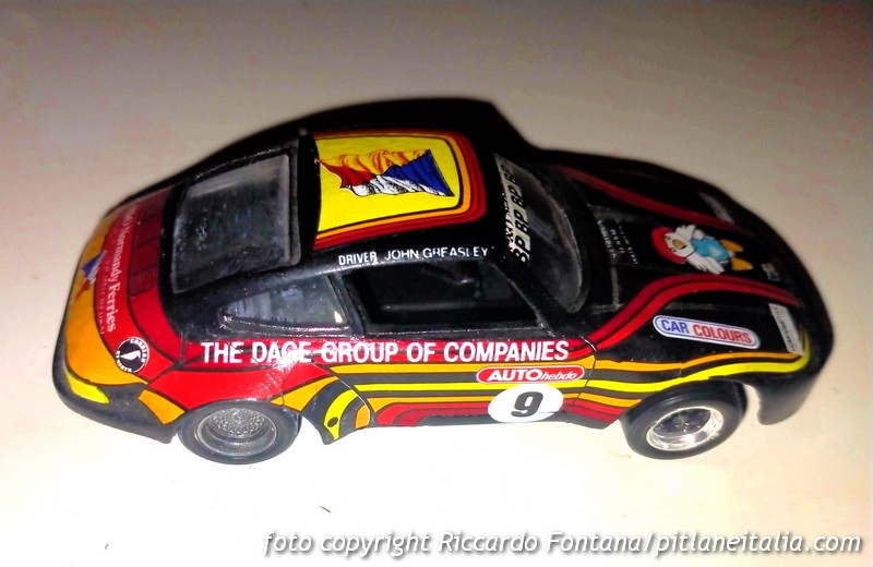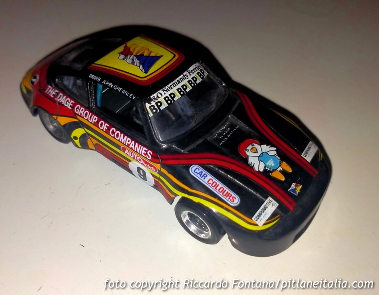 Come si faceva un modello inedito all’epoca? Un Solido di serie, un a scocchina Graphyland in resina, un foglio di decals, ed il resto ricavato da sé (questa 911 ha parte dell’abitacolo addirittura ricavato in carta, ed il roll-bar ricavato in tubetti di plastica di provenienza evidentemente fortunosa), e tutto era certamente più bello, sano, ed economico di quanto non sia ora.