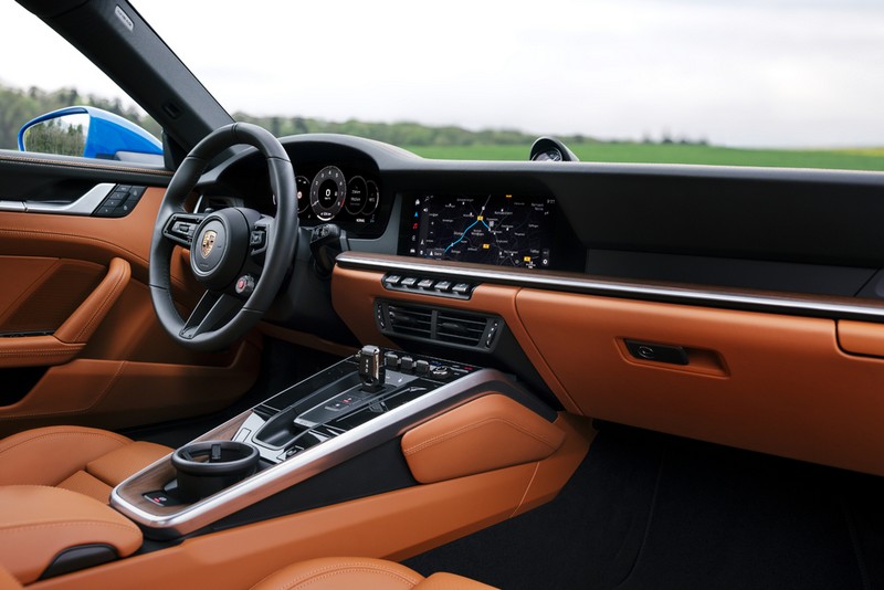 Nelle varianti coupé, Porsche ha progettato gli interni della nuova 911 con una configurazione a due posti di serie. La configurazione 2+2 è disponibile come optional senza costi aggiuntivi. Nell’abitacolo, Porsche coniuga il noto DNA stilistico della 911 con la più moderna tecnologia: il sistema di comando Porsche Driver Experience è centrato sull’asse del guidatore e su modalità di utilizzo intuitive e più rapide. I comandi essenziali sono stati disposti direttamente sul volante o intorno ad esso. Tra questi figura il selettore della modalità di guida standard, la leva di assistenza alla guida modificata e, per la prima volta nella 911, il tasto di avviamento, ovviamente posizionato a sinistra del volante. Nel comparto portaoggetti della console centrale della nuova 911 è presente un vano refrigerato per gli smartphone, con funzione di ricarica a induzione.
