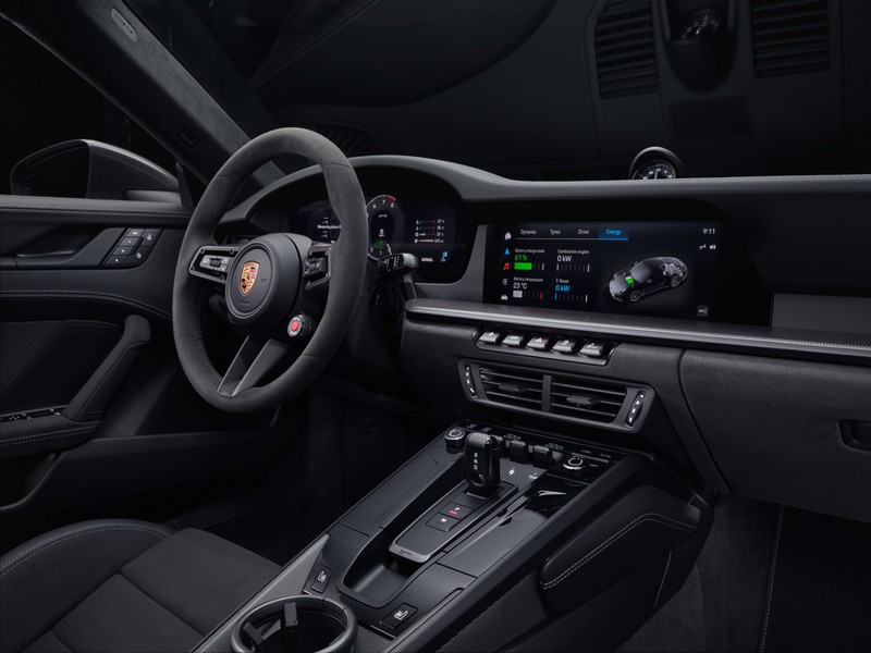 Il powertrain si avvale anche di un motore sincrono a magneti permanenti integrato nella nuova e più potente trasmissione a doppia frizione (PDK) a otto rapporti. Anche a regime minimo, assiste il flat-six con una coppia motrice supplementare fino a 150 Nm e fornisce un incremento di potenza fino a 40 kW. Porsche abbina entrambi i motori elettrici a una batteria ad alto voltaggio leggera e compatta. Quest’ultima corrisponde, per dimensioni e peso, a una tradizionale batteria di avviamento da 12 volt, ma può immagazzinare fino a 1,9 kWh di energia (lordi) e funziona con una tensione di 400 V. Per ottimizzare il peso complessivo, Porsche ha optato per una batteria leggera agli ioni di litio per l’impianto elettrico di bordo da 12 V.