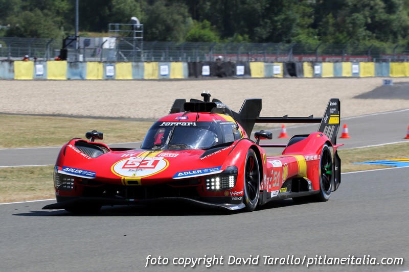 Preludio della vittoria: la Ferrari 499P di Pier Guidi, Calado e Giovinazzi impegnata nella giornata test della 24 Ore di Le Mans, domenica 11 giugno 2023