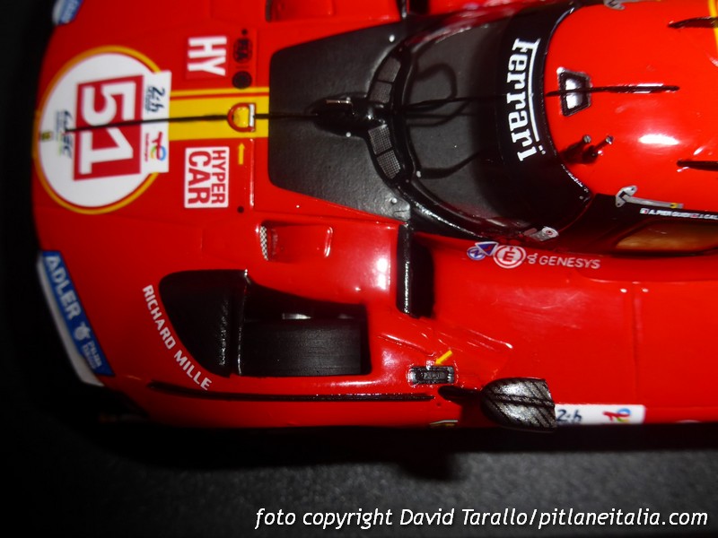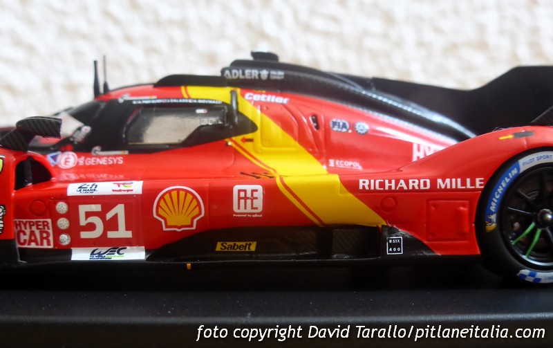 Solito annoso inconveniente, le decals sono stampate a gruppi e questo salta all’occhio: ad esempio, lo stemma col cavallino rampante sul fianco fa corpo unico col Bibendum Michelin più sotto. Il film è sottile e la decal è ben stesa ma uno spessore – per quanto minimo – resta tale e non si può andare contro le leggi della fisica per annullarlo.