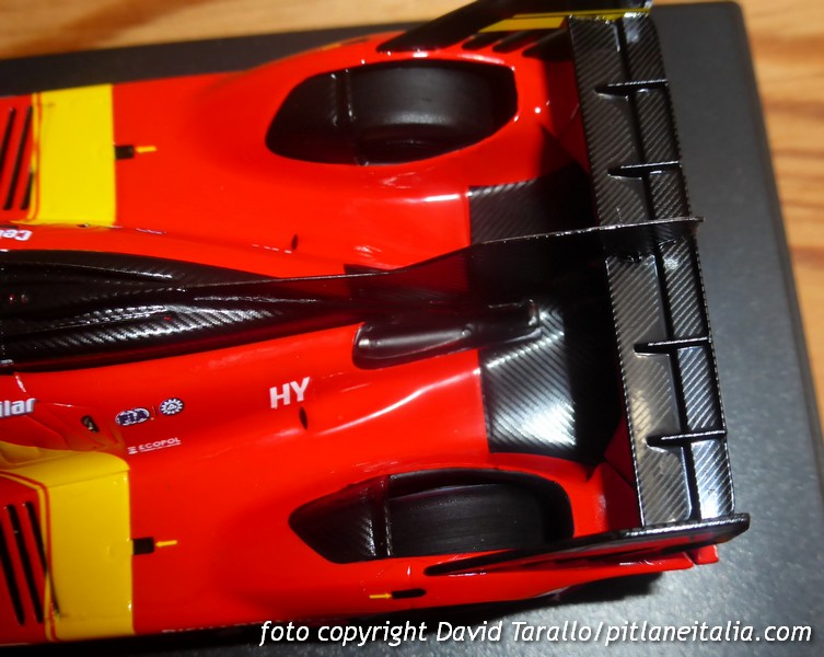 La verniciatura è buona (non eccessivamente liscia e uniforme ma non lo è neanche sulla vettura reale), le varie appendici aerodinamiche sono riprodotte con fedeltà e applicate con cura, e tutto quanto appare equilibrato e ben concepito. Insomma, da trenta o quaranta centimetri il modello è assolutamente a posto. E’ a posto anche se lo si guarda più da vicino, apprezzando molti dettagli di ottimo livello, quali le ruote, le trame del carbonio, i fari o le grigliature.