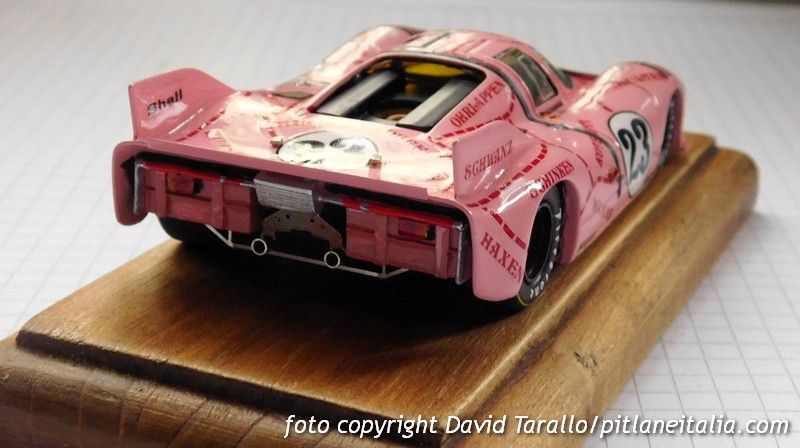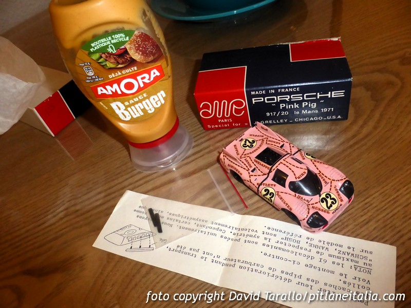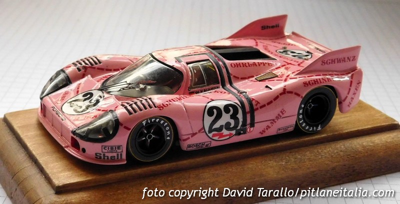 Flashback n.1: 1981. Una vita fa. A undici anni della Pink Pig non sapevo praticamente nulla ma vivevo bene uguale. Sapevo però abbastanza della 917 in generale, tanto da chiedere a mariocarafa1. Un bel giorno di fine 1981, mariocarafa tornò da una borsa di Milano con il kit Minichamps-Danhausen, praticamente la copia dell’AMR che era uscito solo montato qualche anno prima (altra cosa che bellamente ignoravo). Ricordo ancora i momenti di eccitazione nell’aprire la scatola, passando lo sguardo sui non molti pezzi in metallo bianco, sulle decals, sulle ruote… in plastica (ma allora non si faceva caso a questi particolari; del resto anche oggi gli Spark hanno le ruote in plastica, di cosa stiamo parlando…). “Il colore – mi avvertì mariocarafa – è particolare, passa una volta in laboratorio che te lo faccio”.