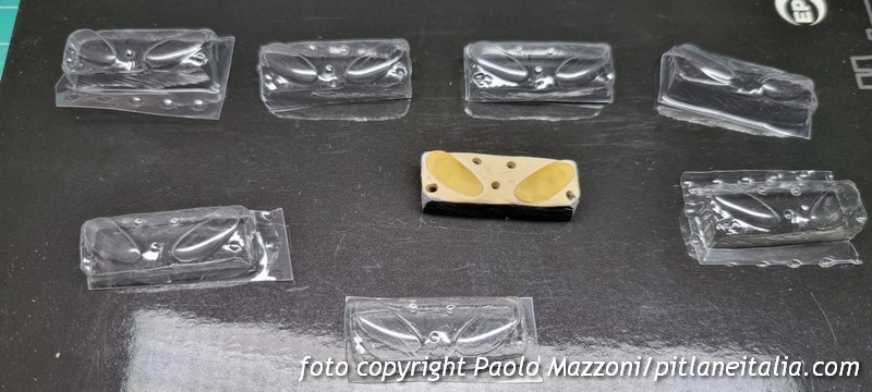 C’erano due cose che andavano rigorosamente modificate/cambiate per ottenere un risultato più attuale, i cerchi e i fari. Per i cerchi nessun problema: ho usato quelli consueti che monto sulle 917 con un bel disco freno in fotoincisione e le gomme nuove, e l’assetto è rimasto perfetto come gli originali. Per i fari, ho scelto di utilizzare i due pezzi di resina piena come master per stampare in acetato le calotte, come di solito facciamo per altri modelli; il risultato è stato soddisfacente. All’interno poi dell’alloggio ho messo due supporti, verniciati di nero, per poter montare un faro attuale (questa vettura aveva un solo fanale per parte).