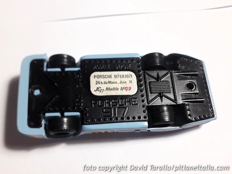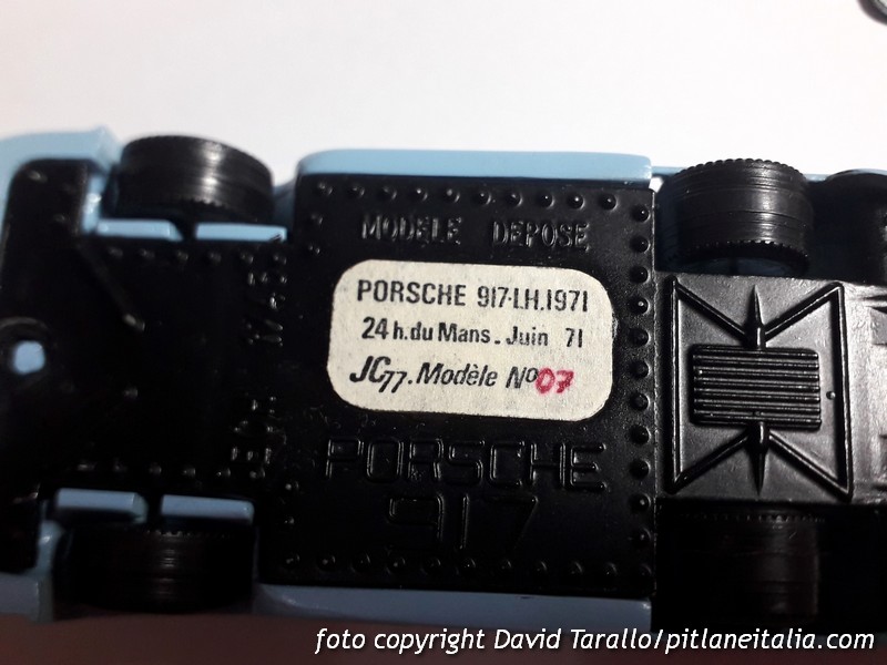 Sulla base di una Porsche 917 di Safir è stata ricavata una carrozzeria LH tipo 1971 in resina. Sul fondino è incollata un’etichetta che recita: Porsche 917-LH.1971 / 24h du Mans. Juin 1971 / JC77 Modèle n°07, con il numero 07 scritto a penna o a pennarello. Una serie limitata venduta montata, dunque, da un modellista-artigiano. Le lettere JC sono presumibilmente le iniziali del suo nome (o del suo nome e cognome), mentre il numero 77 potrebbe riferirsi all’anno di inizio o – direi ancora più probabilmente – al dipartimento francese di provenienza, perché sicuramente questa è una produzione transalpina. Il dipartimento 77 corrisponde alla Seine-et-Marne, nell’Île-de-France. Il discorso potrebbe essere plausibile perché si tratterebbe di una delle tante produzioni che nacquero e fiorirono nella capitale, a un certo punto favorite anche dalla nascita della BAM, vero punto di aggregazione per i talenti del posto.