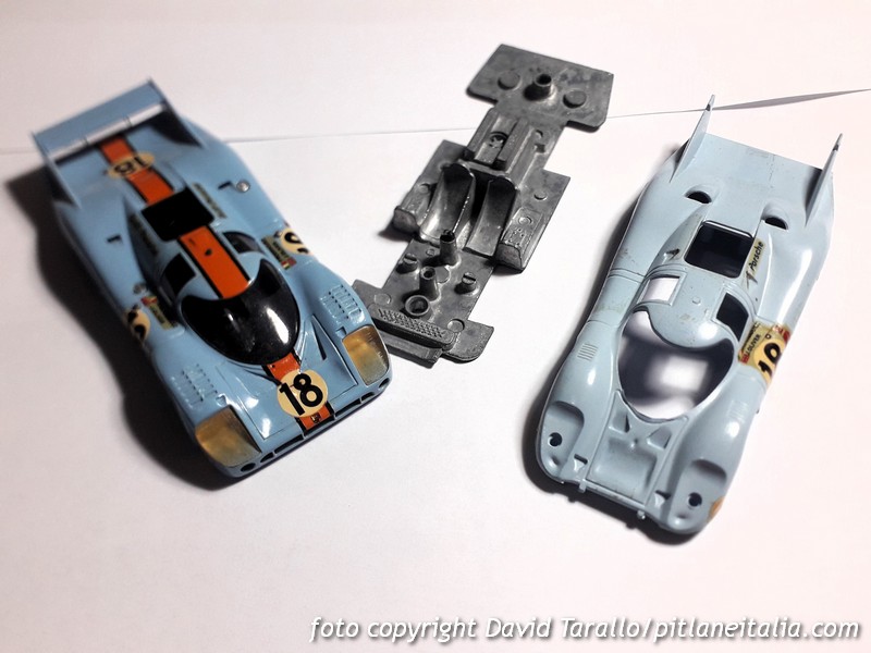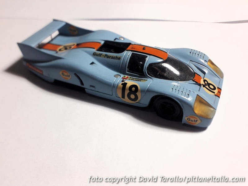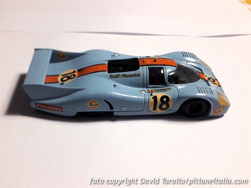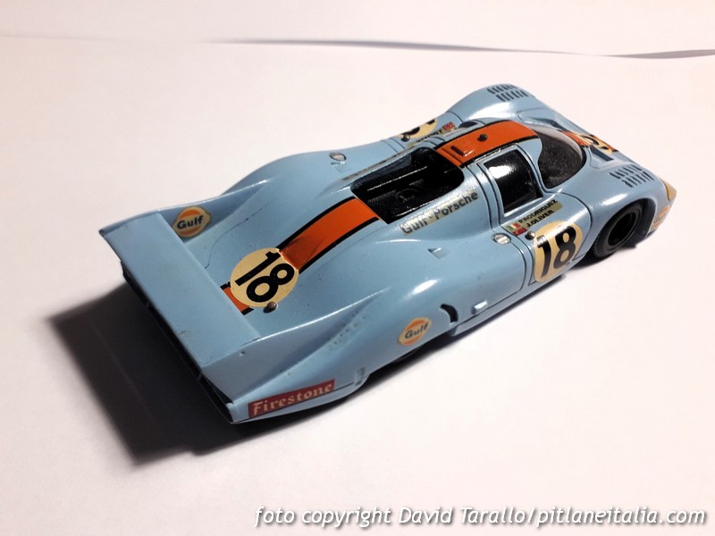 Tutti sanno che Safir, dopo aver riprodotto correttamente la Porsche 917 coda lunga nella configurazione 1970, non modificò il prototipo per le versioni 1971. I collezionisti non ci rimasero gran che bene ma all’epoca o mangiavi la minestra o saltavi la finestra. Tradotto in termini modellistici, o scrivevi a M. Daffaure, nella patria dei pomodori, o prendevi un Solido per elaborarlo. Nel primo caso dovevi avere i contatti giusti, nel secondo dovevi essere Efesto per fronteggiare la durissima zamac del Solido (di nome e di fatto). Arrivarono poi i primi kit ma la 917 non fu un soggetto troppo riprodotto, almeno sulle prime. Vi fu quindi chi in questo vuoto di mercato seppe vederci un’opportunità, come un marchio che – ve lo confesso – ignoravo del tutto fino a qualche giorno fa, quando mi sono imbattuto nel modello che vedete nelle foto.