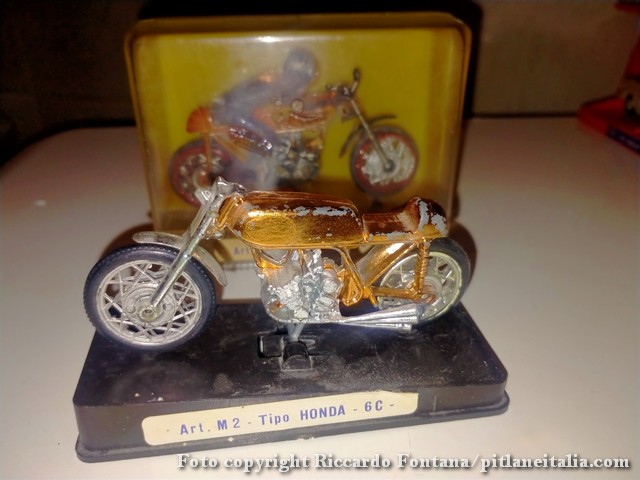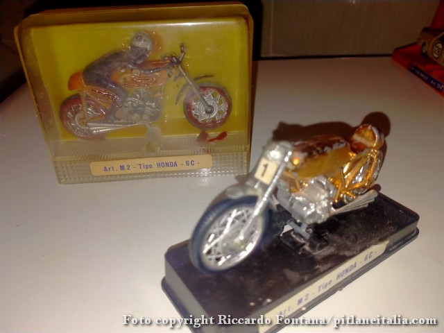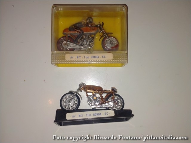 No, e la coppia di modelli qui raffigurata lo dimostra appieno: si tratta due Honda cosiddette “Tipo 6C” (come da etichetta), che altro non sono che la riproduzione in die-cast in scala 1:24 della mirabolante Honda RC 166 250 6 cilindri in linea bialbero con cui Mike Hailwood demolì ogni concorrenza nel biennio 1966-1967, non solo nella classe 250 ma – limitatamente al 1967 e con una versione portata a 297 c.c. – anche nella classe 350.