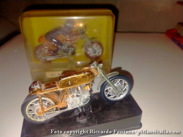 Il modello è palesemente lo stesso nonostante le ruote orridamente squagliate, con in più un pilota (che si innesta su dei semi-manubri ridicoli che sono esattamente i suoi, quindi l’altra non era incompleta da questo punto di vista) un contagiri (questo sì mancante sull’altra) e… nessuna carenatura.