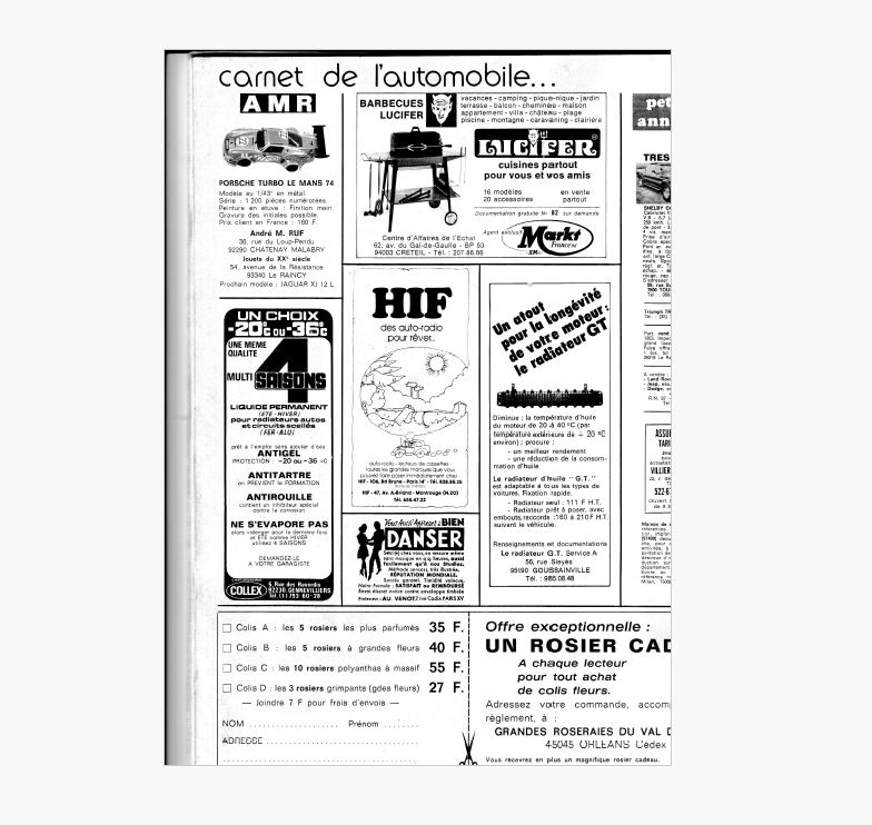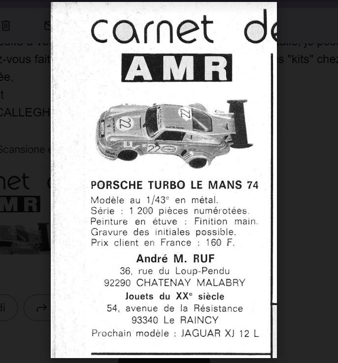 Capita spesso, sfogliando vecchi periodici, di imbattersi in curiosità ormai del tutto dimenticate, come certe pubblicità che rivelano un mondo che non c’è più. Il nostro lettore francese Jean-Marie Callegher, che ricordiamo aver dato un contributo fondamentale a proposito della Porsche 917 marchiata JC77 apparsa su PLIT alcune settimane fa, ci ha inviato stamani la scansione di un annuncio pubblicato sulla rivista L’automobile dell’aprile 1975, che informa dell’uscita del primo AMR, la celebre Carrera RSR Turbo. Un modello non certo economico (160 franchi francesi), ma destinato a cambiare il panorama del settore dell’1:43. La possibilità di far punzonare le iniziali dell’acquirente sul fondino insieme al numero di serie trova riscontro in alcuni esemplari che ho visto di persona nel corso anni. Ma non dovettero essere in moltissimi ad approfittarne. In quel periodo Ruf aveva già in mente almeno uno dei modelli successivi della produzione, la Jaguar XJ berlina.