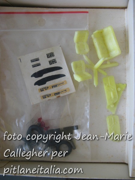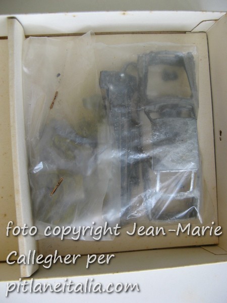 Concentriamoci invece sul kit: notiamo che la carrozzeria è grezza4. Troviamo poi le bustine con i pezzi in plastica e la calandra trasparente. Le decals ad acqua hanno due cruscotti e due targhe identiche.