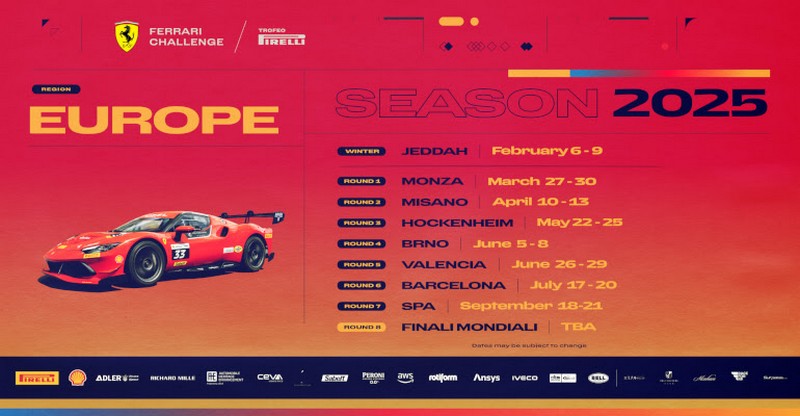| Cinque i Paesi che ospiteranno il monomarca del Cavallino Rampante, ad iniziare dall’Italia dove la stagione prenderà ufficialmente il via, dal 27 al 30 marzo, presso l’Autodromo Nazionale di Monza, e che ospiterà anche il secondo round, previsto a Misano dal 10 al 13 aprile. La Germania, con lo storico tracciato di Hockenheim, vedrà protagoniste le vetture del Cavallino Rampante dal 22 al 25 maggio, dando il via ad una fase molto intensa del calendario, con sfide che si proporranno a breve distanza tra loro. La Repubblica Ceca, dal 5 all’8 giugno, ospiterà a Brno il quarto round prima della doppia trasferta spagnola a Valencia e Barcellona. Sul Ricardo Tormo le Ferrari scenderanno in pista dal 26 al 29 giugno, mentre sul Circuit de Catalunya dal 17 al 20 luglio, prima della pausa estiva. Lo spettacolare tracciato di Spa-Francorchamps, in Belgio, dal 18 al 21 settembre sarà il teatro del penultimo atto stagionale, prima di quello delle Finali Mondiali 2025 che si svolgeranno in una località che sarà svelata solamente durante il fine settimana delle Finali Mondiali 2024 di Imola. Dopo il successo degli ultimi anni, i partecipanti del Ferrari Challenge Trofeo Pirelli potranno preparare l’inizio della stagione con il Winter Challenge, appuntamento “off-season” che avrà nella velocissima e scintillante sede della “Corniche” di Jeddah, in Arabia Saudita, il suo teatro dal 6 al 9 febbraio. |