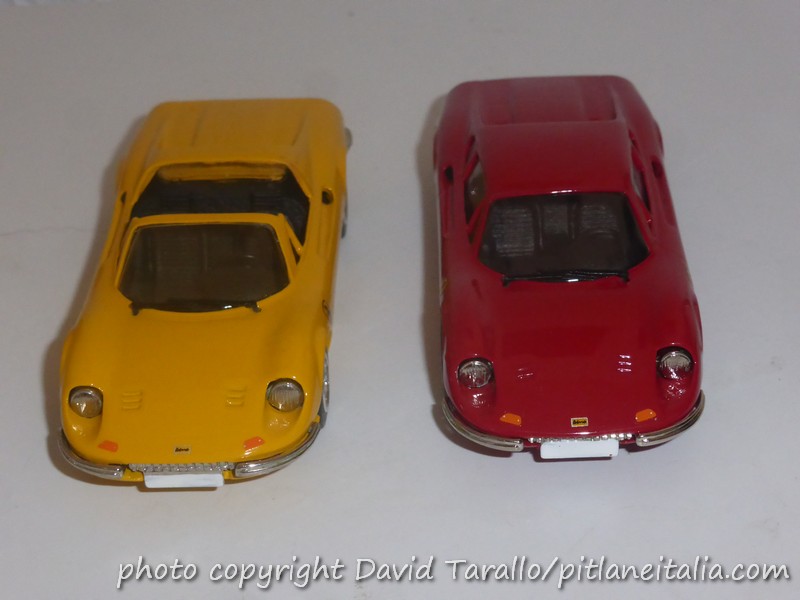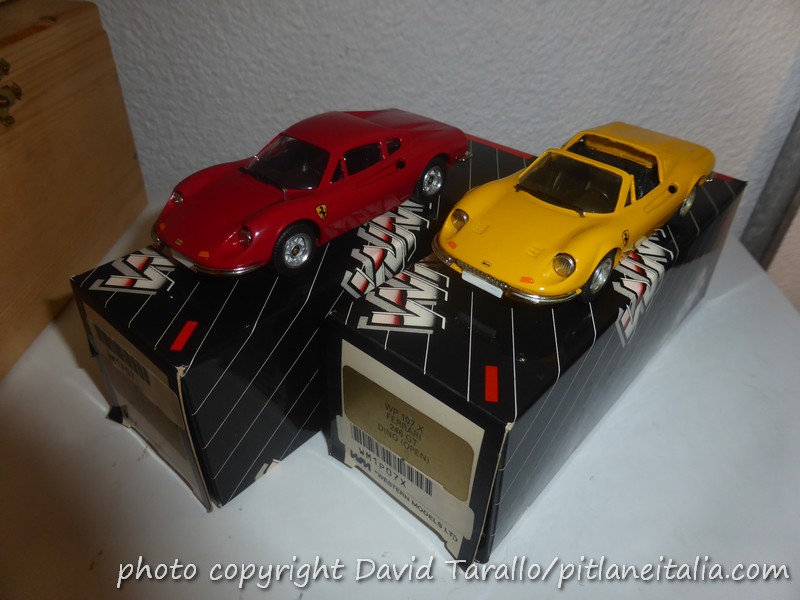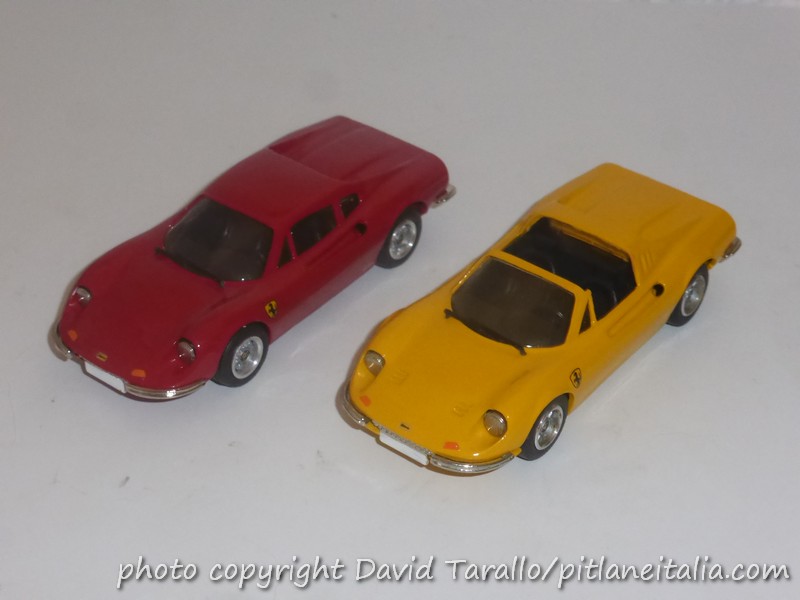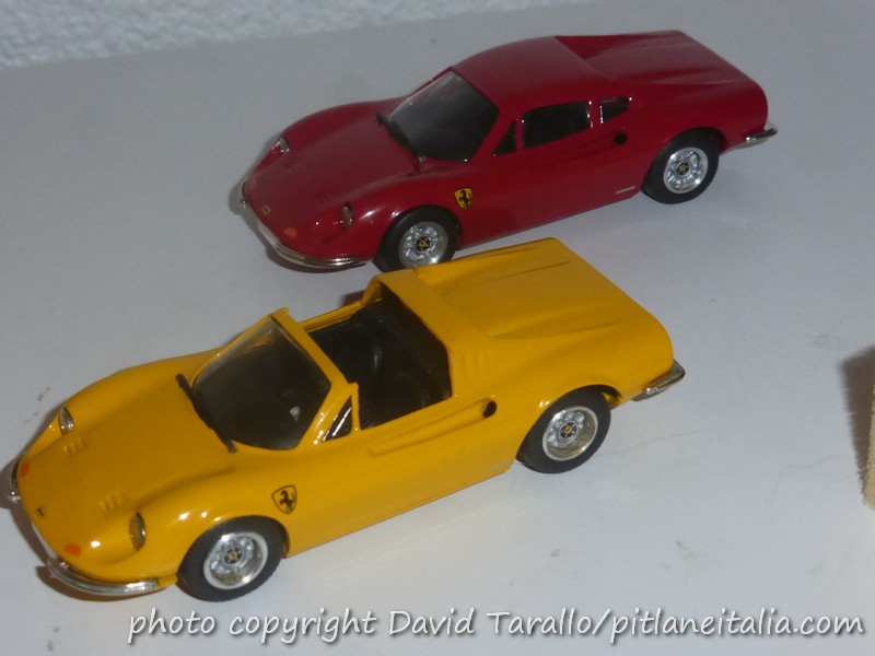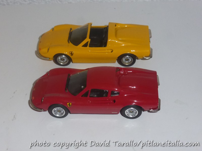 La Dino di Western fu proposta in tutte e due le configurazioni, berlinetta GT e “targa” GTS. Disponibile in kit e montata, la Dino inglese ebbe un buon successo di vendite. Oggi non è un modello raro ma come sempre la difficoltà consiste – per i montati – di reperire un esemplare in condizioni perfette con scatola e imballaggio originali. I modelli factory built della GT dovrebbero essere tutti rossi, mentre per la GTS si scelse il secondo colore più adatto a una Ferrari, ossia il giallo. I contorni vetro non erano dipinti ma in compenso altri dettagli erano trattati con cura. Belle ad esempio le ruote realizzate con una soluzione tipica dell’epoca: cerchio tornito e pastiglia centrale in metallo bianco. Il fondo della vettura presentava alcuni dettagli finemente incastrati al telaio. Di ottimo effetto i quattro scarichi nichelati. Per buona parte degli anni ’80, la Dino di Western costituì una scelta più che decente per chi volesse inserire in collezione quella che ancora oggi resta una delle vetture stradali più belle della storia del Cavallino. Arrivarono poi AMR (con prezzi decisamente più alti, specie per quanto riguardava i factory built), poi negli anni ’90 fu la volta del Dinky-Matchbox e dell’Heco – ai due poli opposti della fascia di prezzo! – per proseguire col Bang, un ottimo modello alla portata di quasi tutte le tasche.