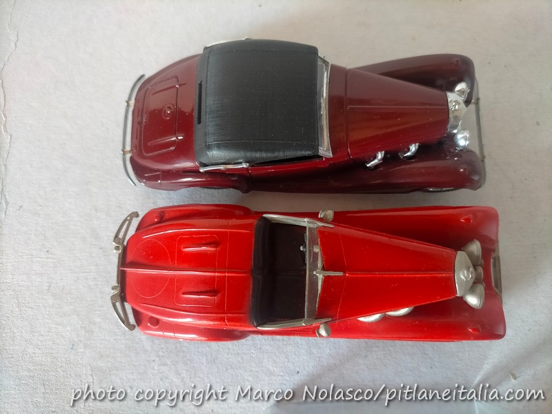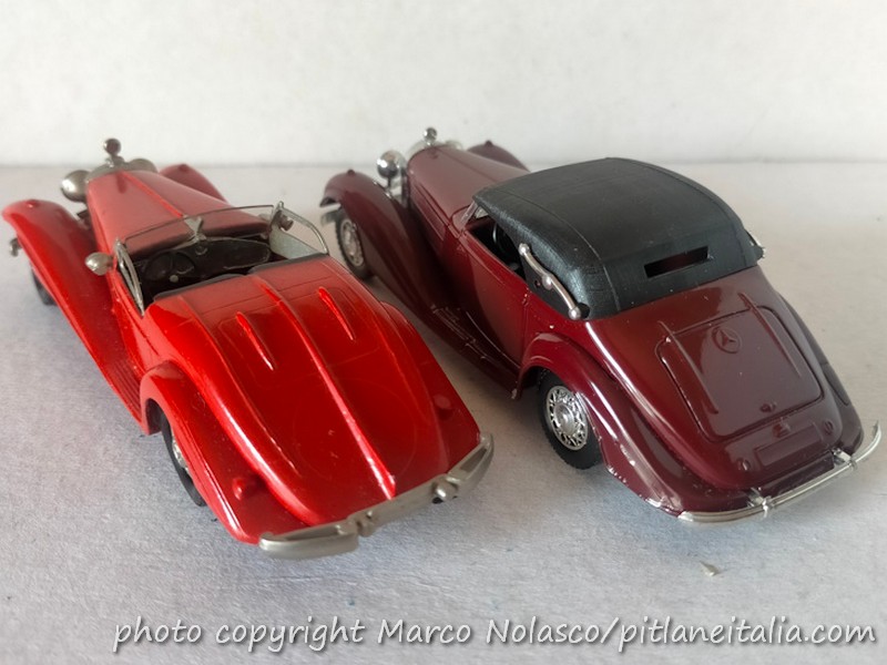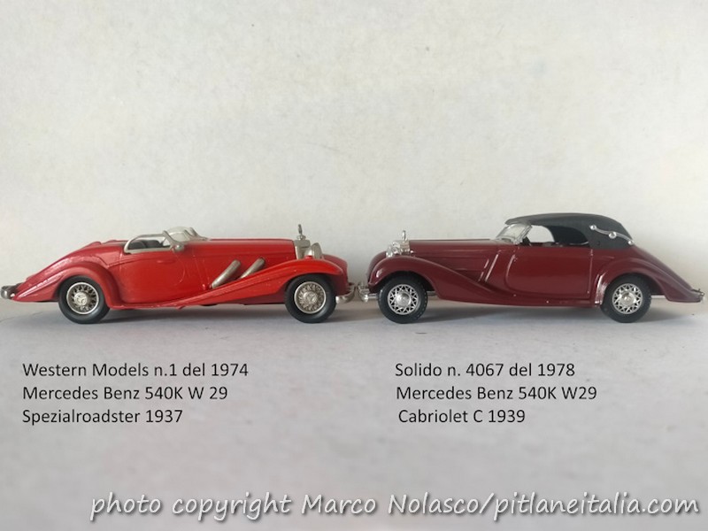 Già che ci sono lo confronto con una riproduzione industriale di una vettura simile, sempre una Mercedes Benz 540K W29, ma con carrozzeria cabriolet C del 1939, se non sbaglio, nell’interpretazione del 1978 di Solido, n.4067. Più estrema e sportiva la due posti Spezialroadster, più confortevole la Convertibile a quattro posti.