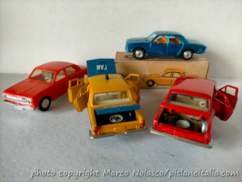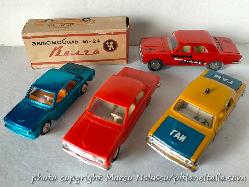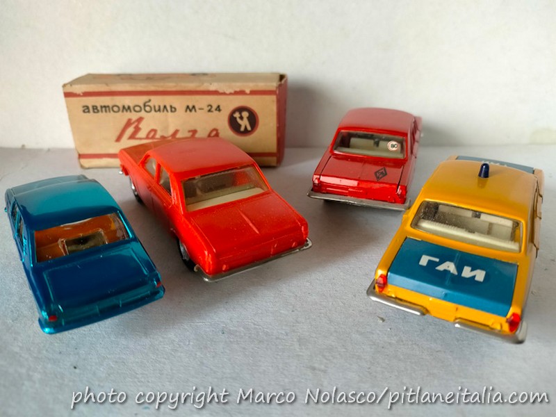 La affianco ad altre due interpretazioni sempre sovietiche e sempre di quegli anni, una della Chernomorskaya Igrushka di Odessa. E’ un modellino in plastica piuttosto fedele, ma dimesso, in vera scala 1/43. Le altre due sono della Saratov e riproducono una vettura della Polizia e una delle Poste. Qualità molto alta, anche i materiali, visto che non vi è traccia delle bolle che infestano modelli di vetture più “plebee” come Moskvich e Lada. Una curiosità, la Volga della Polizia monta al posteriore un paraurti a due lame, probabilmente era una versione diversa della vera, ma le foto che ho trovato sono tutte di vetture a paraurti intero. Anche le ruote di scorta nel bagagliaio sono diverse, con copri cerchio cromato nell’auto della Polizia e senza nell’altra.