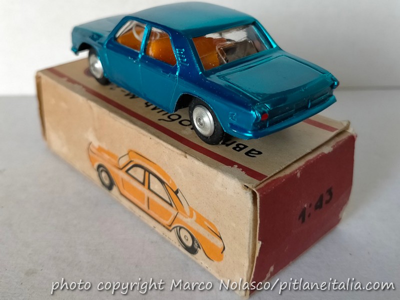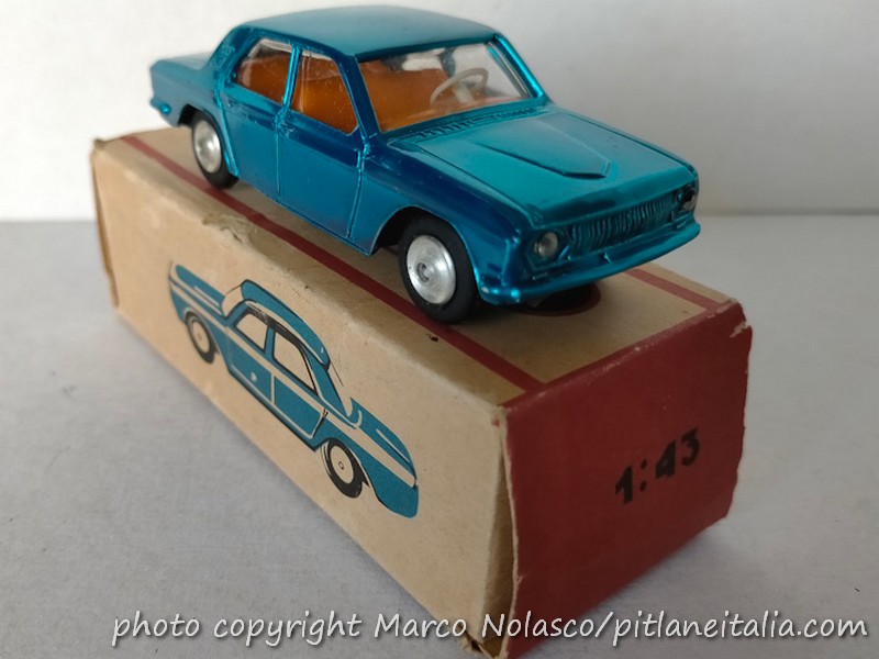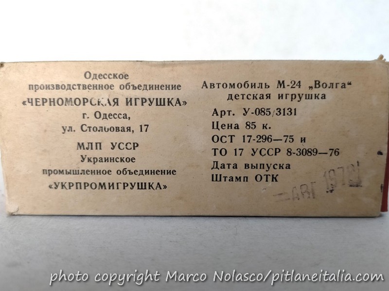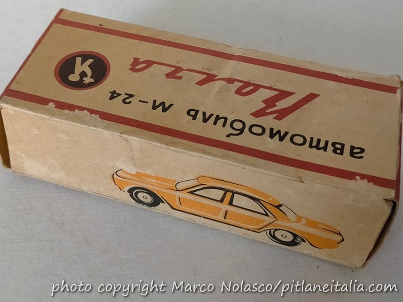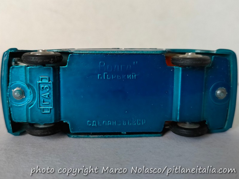 Le analogie con la marca del cagnolino della fu Sua Maestà riguardano anche la tinta, i cerchi e la scala che, nonostante sia dichiarata 1/43 sulla scatola, è vicina all’ 1/50. E’ attribuita alla Gorki e ne esiste anche una versione a quattro fari, che furono montati anche sulla vera in pochi esemplari.