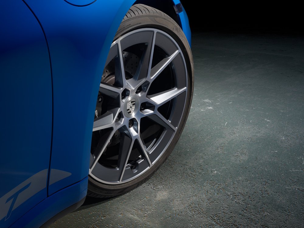 La 911 Carrera T monta cerchi in lega leggera Carrera S da 20/21 pollici, con pneumatici 245/35 ZR20 all’anteriore e 305/30 ZR21 al posteriore.