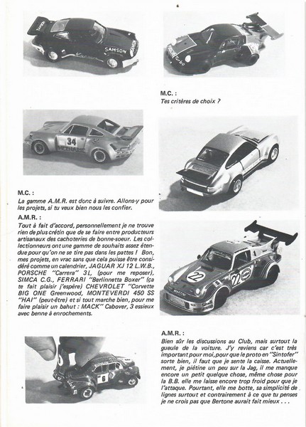 Nel primo numero con veste rinnovata, Minia-Cars pubblicò un’intervista di quattro pagine con Andrié-Marie Ruf, socio del club, che aveva appena fatto uscire il modello del debutto, la Porsche Carrera RSR Le Mans 1974, destinato a restare nella memoria collettiva di collezionisti e modellisti, è quasi inutile ricordarlo. Ebbene, nei giorni scorsi ho ritrovato la rivista e ho pensato di pubblicare una traduzione in italiano del pezzo. Non credo ci siano ormai problemi di copyright a distanza di ormai cinquant’anni. In calce riproduco anche le pagine dell’intervista, che contenevano foto di diversi modelli elaborati e montati da Ruf. Dall’intervista emergono diverse curiosità, la più particolare delle quali mi pare il rifiuto espresso dal modellista di produrre kit. “Nessun kit con nome AMR”, dichiarò categorico. In realtà fu fedele all’intento perché i suoi kit uscirono… col marchio “X”! Battute a parte, emerge un personaggio con le idee già ben chiare, determinato a distinguersi dal gruppo. In un modo o nell’altro, ci riuscirà per trent’anni.