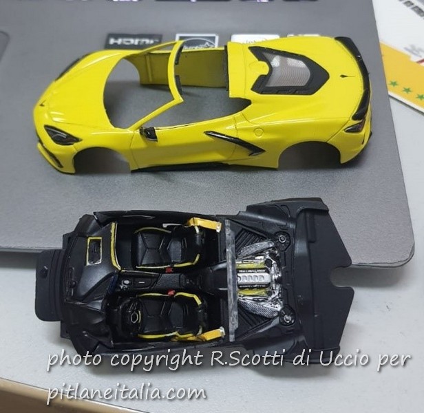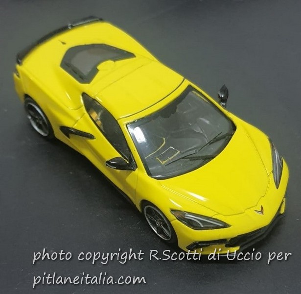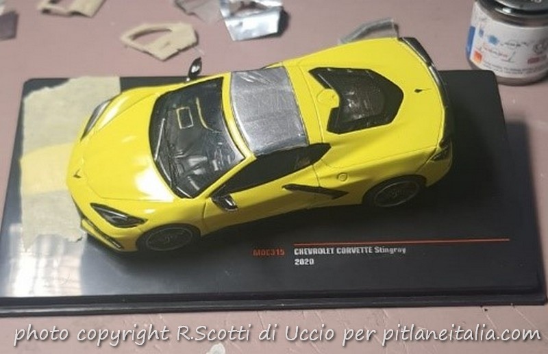 In questo caso, per interrompere i miei lavori sulle Mercedes CLK GTR, in tutte le varie versioni ed aggiornamenti, ho tirato fuori dall’armadio la Corvette C8 della Ixo, comprata poco tempo fa. Un bel modello, all’esterno e all’interno, con bei dettagli anche nelle pinze dei freni… ma come al solito con gli interni che, seppur ben modellati, non godono neanche di quei piccoli tocchi di colore che li ravvivino.