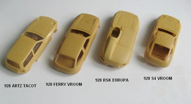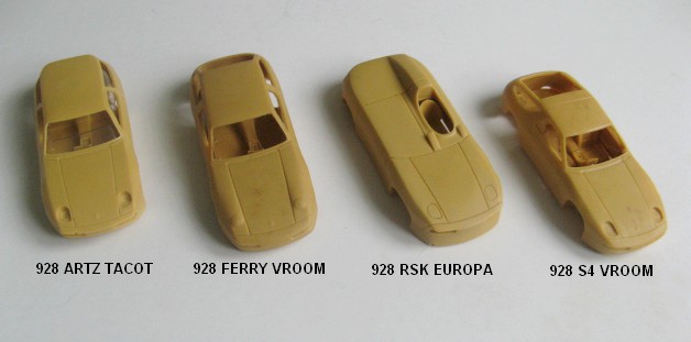 Nelle due foto sotto, sono visibili un transkit MRF che permetteva di ricavare la 928 S dalla base Solido standard, la 928 GT della produzione più recente Solido (referenza 1525, datata giugno 1991) e la carrozzeria dell’Heller.