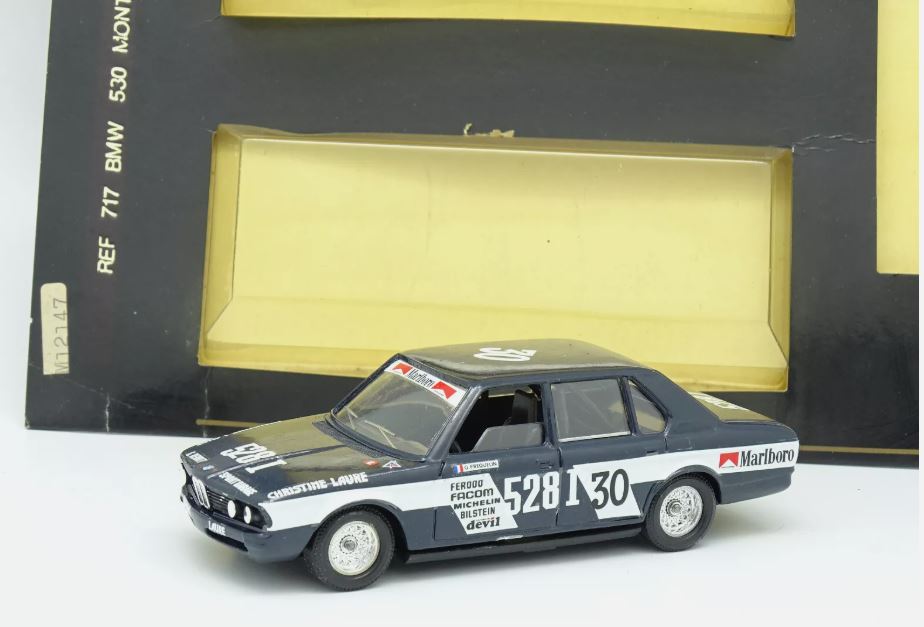 Torniamo alla BMW. Sul finire del 1987, Verem tirò fuori – un po’ a sorpresa2 – una E12 da competizione. Si trattava della vettura che Guy Fréquelin aveva pilotato a Montlhéry nel campionato francese Produzione 1980. Il modello, art. 717, veniva venduto montato e con le decals da applicare, come d’abitudine nelle edizioni Verem di quel periodo3. Il foglietto di decalcomanie, stampato da Cartograf, era datato ottobre 1987.