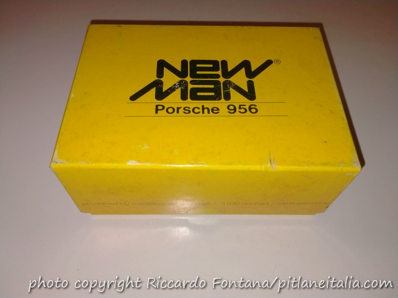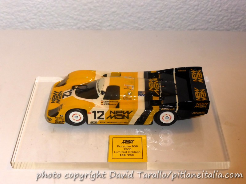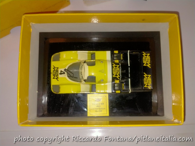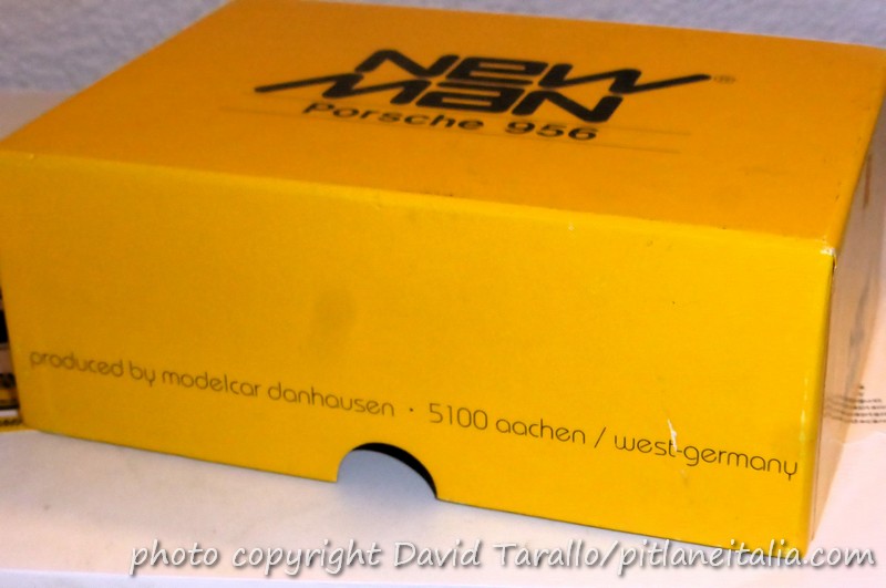 Un primo gruppo di modelli promozionali portava la livrea presentazione, quella col numero 4. La 956 in 1:43, decisamente pesante, era fissata a una base in plexi fumé e sistemata in un bel cofanetto che portava i riferimenti di Danhausen Modelcars e i colori dello sponsor New Man. Nessuna allusione al team Joest. Sulla base era applicata un’etichetta che indicava il numero progressivo nella serie di 250 modelli e ciascun esemplare aveva la matricola punzonata sul fondino.