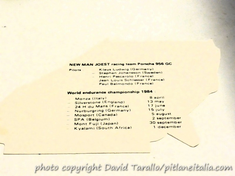 Il verso dell’adesivo mostrato sopra, con la lista dei piloti del team Joest per il 1984 e il calendario del Mondiale Endurance