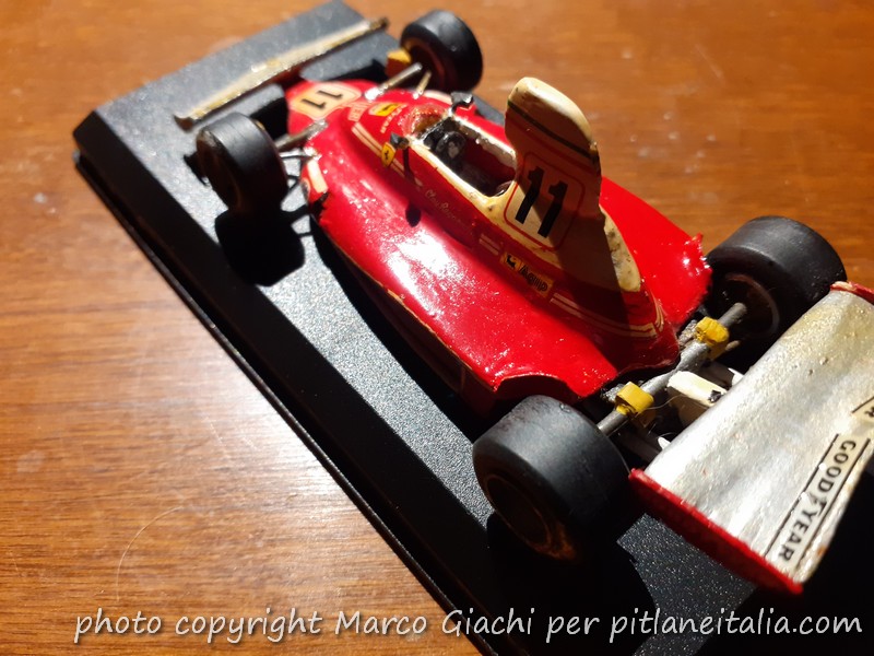 La 312T ha una forma caratteristica con la grande presa d’aria a periscopio, e i radiatori all’interno delle ruote anteriori che le conferiscono una linea personale e unica. I primi Gran Premi vengono disputati con la vecchia 312B3 e in Spagna, il primo con la nuova 312T, una collisione al via mette subito fuori sia Lauda che Regazzoni. Ma poi non ce n’è per nessuno: Montecarlo (1° Lauda), Belgio (1° Lauda), Svezia (1° Lauda, 3° Regazzoni), Olanda (2° Lauda, 3° Regazzoni), Francia (1° Lauda), Germania (3° Lauda), Italia (1° Regazzoni, 3° Lauda), Stati Uniti (1° Lauda). A settembre, nel mio piccolo, per dare una forma concreta alla mia gioia di bambino (diciamo ragazzo a 17 anni) mi feci il modellino della 312T in legno di balsa, praticamente scavato da pieno, che è ancora sulla mia scrivania.
