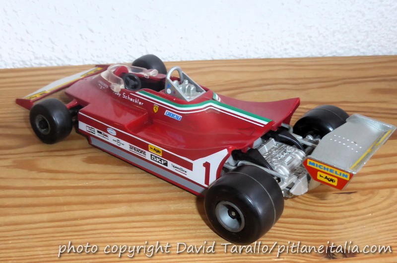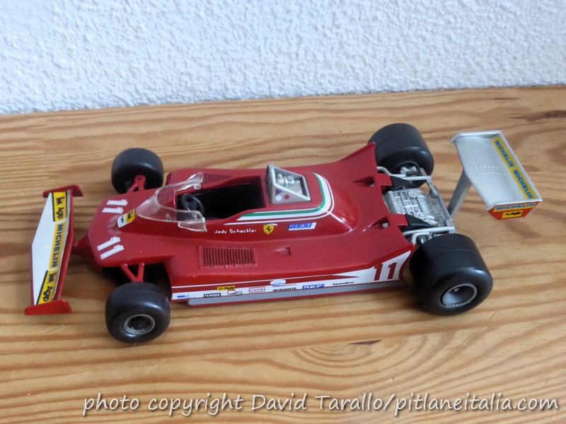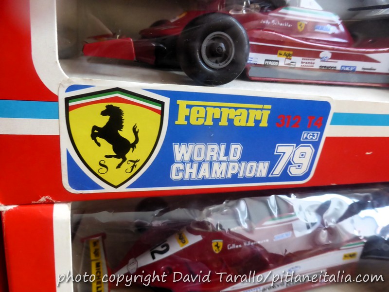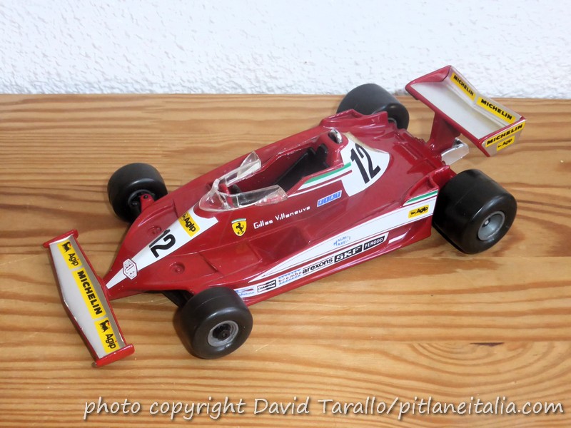 FG3 Ferrari 312 T4 F.1 1979. Polistil non poteva lasciarsi sfuggire l’opportunità di una nuova Ferrari campione del mondo. Il modello uscì nei primi mesi del 1980 ed è alquanto realistico per gli standard dell’epoca. La riproduzione degli specchietti retrovisori in blocco unico col parabrezza, soluzione già adottata con la 312 T3, non era il massimo del realismo ma era pratica e chi avesse voluto, avrebbe potuto benissimo dipingere i particolari in rosso, magari tinteggiando di blu trasparente il vetrino sognando di tenere fra le mani un più costoso Tamiya. Il motore è ben realizzato e si apprezza una ricerca onesta del particolare. Furono commercializzate le versioni di entrambi i piloti, Scheckter e Villeneuve. Questo è un classico modello che brilla ancora oggi di un’energia enigmatica, trasmettendo una scintilla della febbre Villeneuve a chiunque abbia vissuto quegli anni. Anni forse ingenui, un periodo che ci appare favoloso, ricco di sapori, di profumi e di suggestioni primaverili. Forse perché eravamo ragazzini, adolescenti, o comunque tanto più giovani.