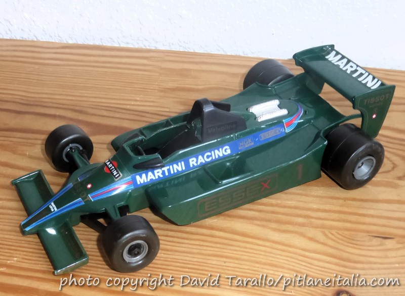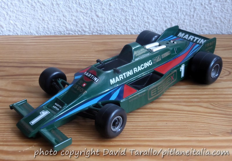 FG2 Lotus-Ford Cosworth 79 F.1 1979. Dopo aver vinto tutto nel 1978, il Team Lotus si ritrovò ad affrontare un 1979 ben più complicato, con la concorrenza di Ferrari, Ligier, Williams e Brabham, che nel frattempo avevano saputo evolversi tecnicamente, schierando monoposto sempre più competitive. La 79 di Polistil è un bel modello, dalle linee corrette, anche se forse meno spettacolare delle Ferrari. Bruttarello il rollbar in plastica nera. La decorazione Essex-Martini è ben realizzata e completa. Fu prodotta solo la vettura di Mario Andretti.
