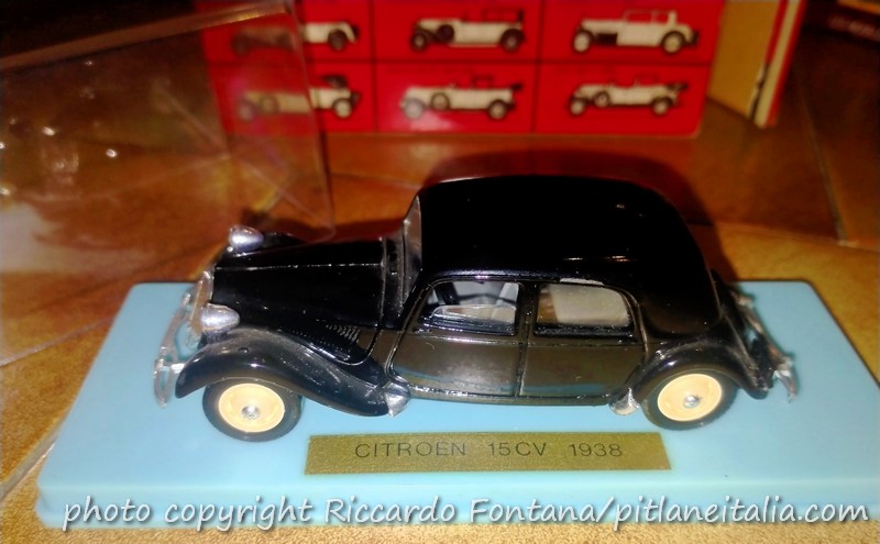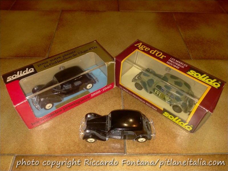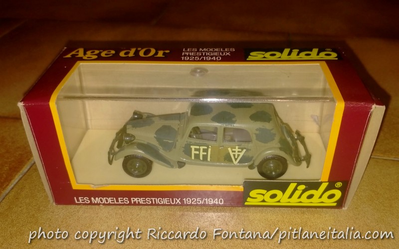 Era inevitabile che una Traction Avant facesse prima o poi la sua comparsa tra le fila dell’Age d’Or, proprio lei che era e sarà sempre la più fulgida esponente delle auto d’epoca francesi (e fa sorridere il fatto che all’epoca dell’uscita del modello Solido la vera TA del 1939 avesse 35 anni, quanto cioè una macchina del 1990 ai giorni nostri, e che la TA stessa fosse definitivamente uscita di scena da appena 17 anni, come se ora parlassimo di un’auto uscita di produzione nel 2008), e venne scelta una versione di grande prestigio in quella gamma Traction Avant che, in realtà, comprendeva auto molto diverse tra di loro, ovvero l’ammiraglia, la 15 CV a sei cilindri su scocca “légère” (quella della 11CV quattro cilindri), resa molto accattivante dai bei cerchi Michelin Pilot asolati tipici delle versioni d’anteguerra.