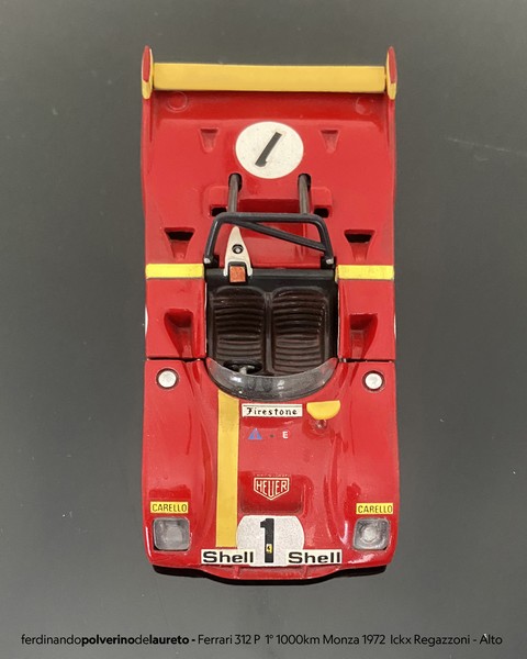 La mia 312P deriva dal classico, ma molto azzeccato nelle linee, Norev 835, di cui va riconosciuto il miglior stampo in serie per la versione 1972 (Mebetoys ne fece uno stampo… incappato incidentalmente in una devastante pressa orizzontale e a riguardo avrei una teoria del perché, Brumm ha pure combinato un po’ di pasticci dimensionali, Ixo è arrivata secoli dopo… con altre tecnologie, il resto è prodotti speciali, ma questa è un’altra storia).