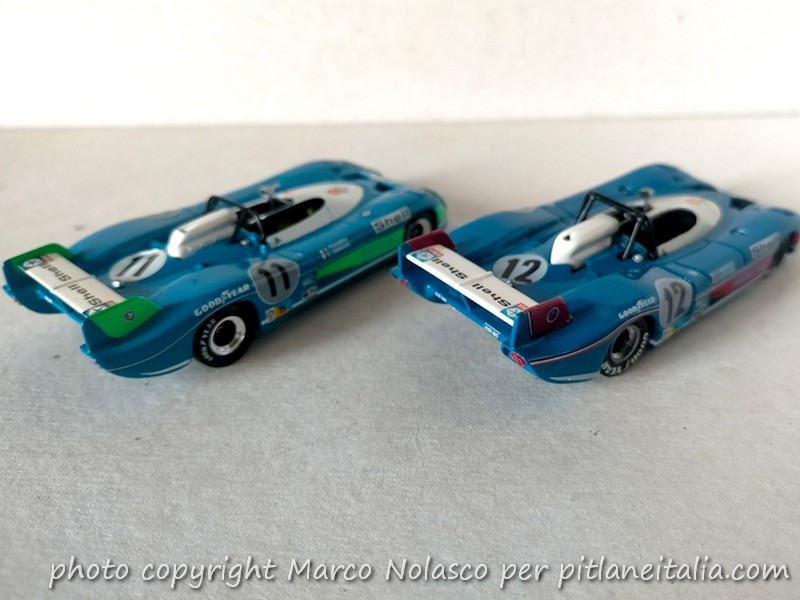 Eccomi con il confronto tra due Matra (di cui Marco mi aveva parlato tempo fa, ndr). Una è la n. 11 vincitrice di Le Mans 1973 con Henri Pescarolo e Gérard Larrousse di Minichamps, n. 731111 uscito nel 2001, l’altra è la gemella n. 12 terza classificata nella stessa gara con i due Jean-Pierre, Jabouille e Jaussaud. Quest’ultimo è il modellino Solido che avevo elaborato nella versione vincitrice con la Guide 2 che avevo già presentato su PLIT1, ma che ho rifatto recentemente in questa nuova veste.