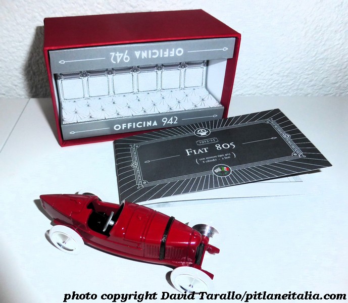 Lussuoso – e del tutto in linea con un gusto torinese garbato e signorile – il confezionamento: scatola in cartone con interno a doppia protezione, chiusura a scorrimento e, a corredo, un libriccino elegante e assai ben documentato sulle vicende tecniche e sportive della vettura, con tanto di foto e disegni tecnici2.