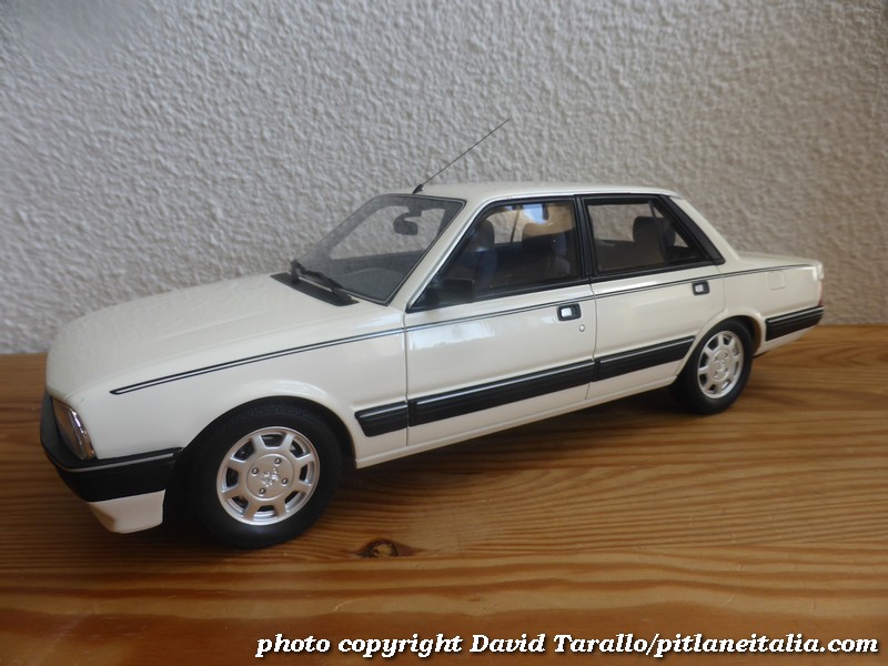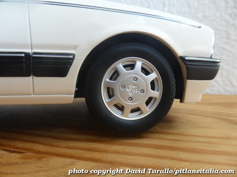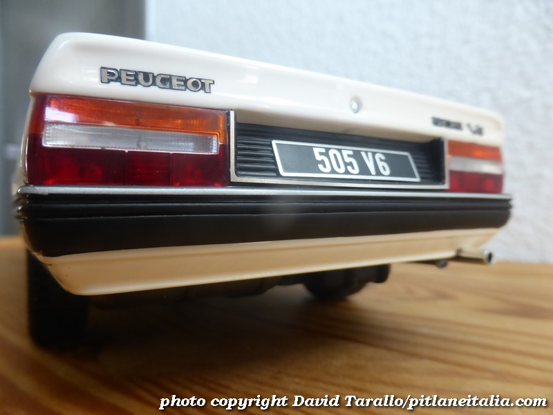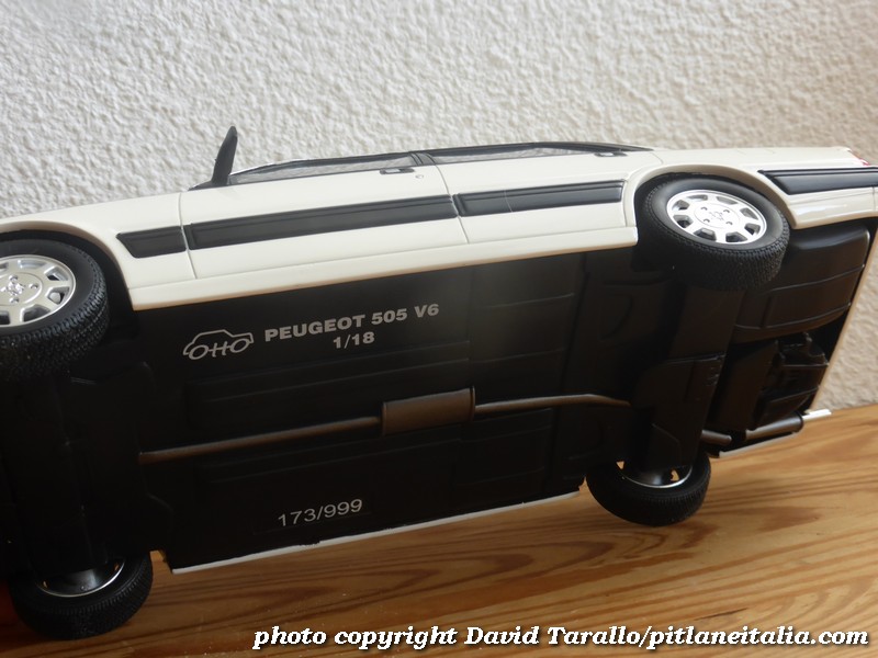 Tra le piccole raffinatezze, si segnala la scritta pubblicitaria sul lunotto che celebra le vittorie di Peugeot nel Mondiale Rally 1985 e 1986, i loghi cromati, il bollo di circolazione francese (ma le targhe sono generiche). Le lampadine all’interno dei fari sono colorate in giallo. Il fondo è semplificato al massimo, con un accenno di struttura del telaio, delle sospensioni e dell’impianto di scarico. Proprio perché non se ne poteva fare a meno, sono state riprodotte la ruota di scorta con i suoi supporti e la base del serbatoio della benzina.