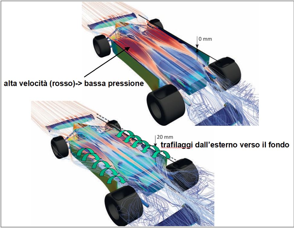 Nel 1977 uscì in Sudafrica la Lotus tipo “78” che aveva delle “banali” spazzole che strusciavano a terra. L’ingegner Forghieri mi ha spiegato che, a rigore, non sarebbe stata regolamentare ma, grazie all’inadeguatezza dei commissari locali, la macchina fu fatta correre e questo aprì la strada ai sigilli laterali, diventati poi “minigonne” rigide scorrevoli, fino ai generatori di vortici e le barriere pneumatiche odierne. Ho verificato di persona, con la simulazione numerica, l’effetto di quel sigillo che è veramente notevole, e capisco il lavoro dei progettisti moderni nel curare tanta attenzione in quella zona.